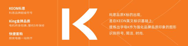 并在KEON英文標識基礎(chǔ)上,提煉品牌超級符號“K”,作為強化品牌品質(zhì)印象的識別符號,也是King金牌品牌(電機終身包換,整機5年保修),更是快捷套購(廚房電器一站購齊)。