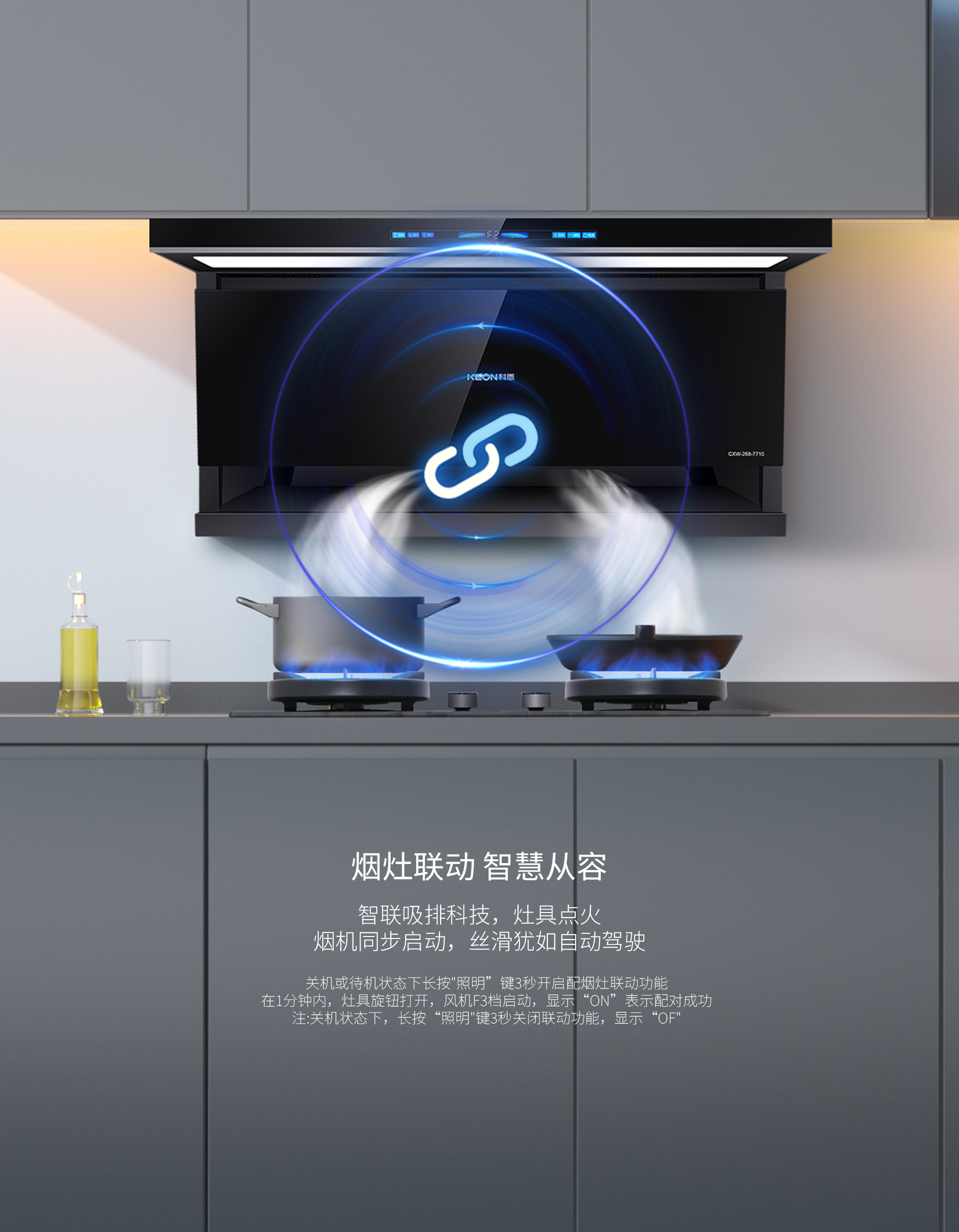 讓科恩7710智能聯(lián)動(dòng)煙機(jī)走進(jìn)父母的廚房,告別油煙滋擾,用科技的力量為他們的健康保駕護(hù)航。在每一次烹飪中,讓愛(ài)與健康相伴,讓這份含蓄而深沉的親情在無(wú)煙的廚房中愈發(fā)濃郁。