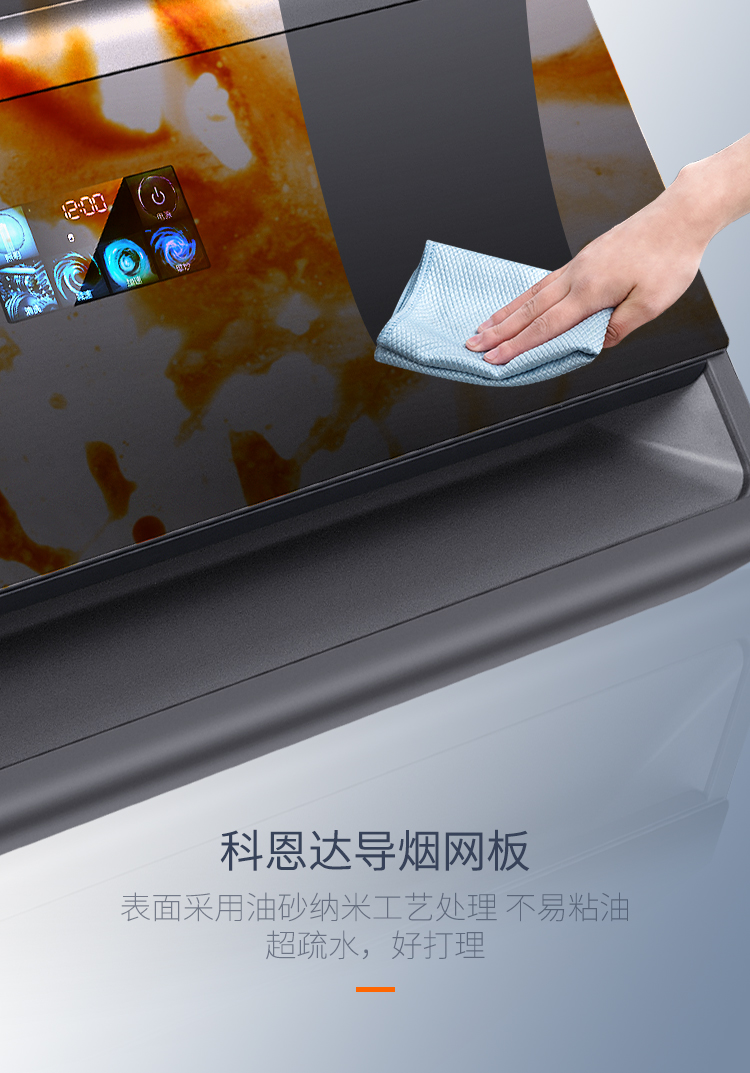 7270整機(jī)采用特氟龍工藝,一體拉伸沖壓成型,美觀大氣,一擦即凈。磁吸式科恩達(dá)網(wǎng)板,一拉一提,拆卸清洗簡單方便,科恩達(dá)網(wǎng)板表面采用油砂納米科學(xué)工藝,讓油污難以附著,超疏水自清潔。電加熱清洗功能,自動甩掉油污。保持煙機(jī)強(qiáng)勁吸力,清潔不再是難題。