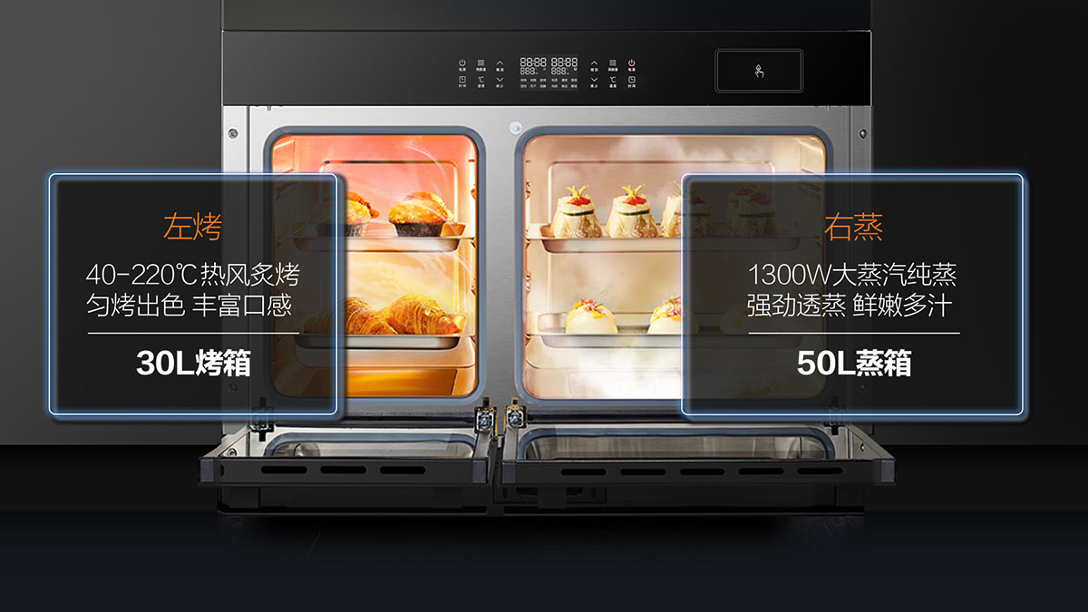 - 蒸烤獨(dú)立,雙管齊下,烹飪更高效