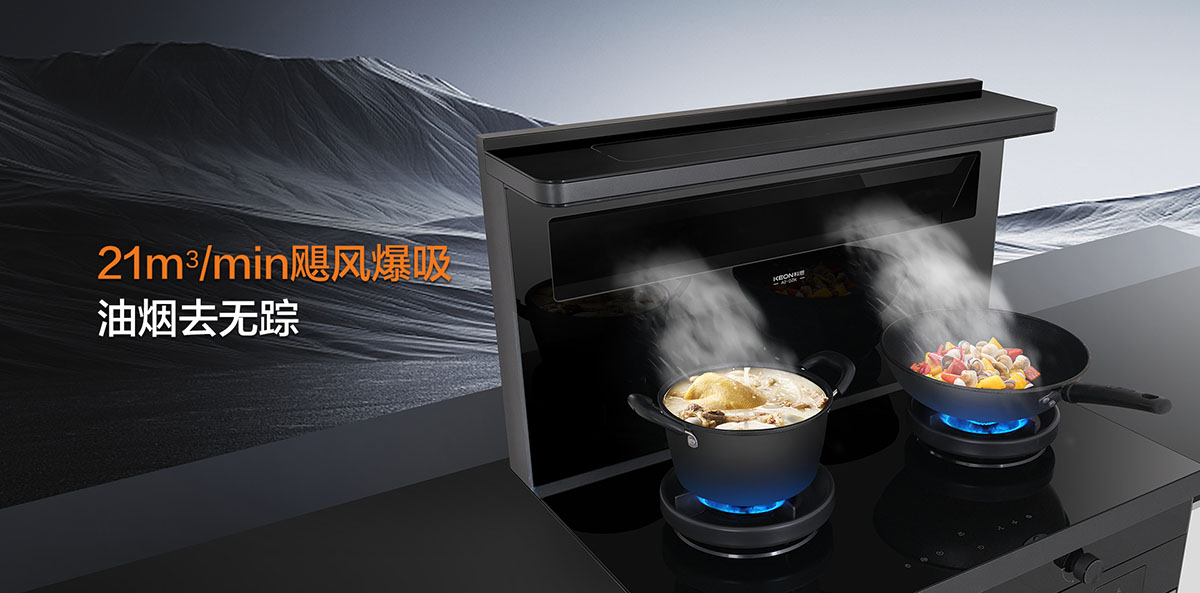 - 21.5m³/min寬域爆吸攏煙,油煙0逃逸