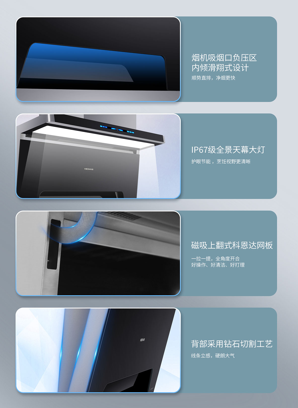 - 105°仰角攏煙設(shè)計(jì),瘦身大空間,翻炒不碰頭
