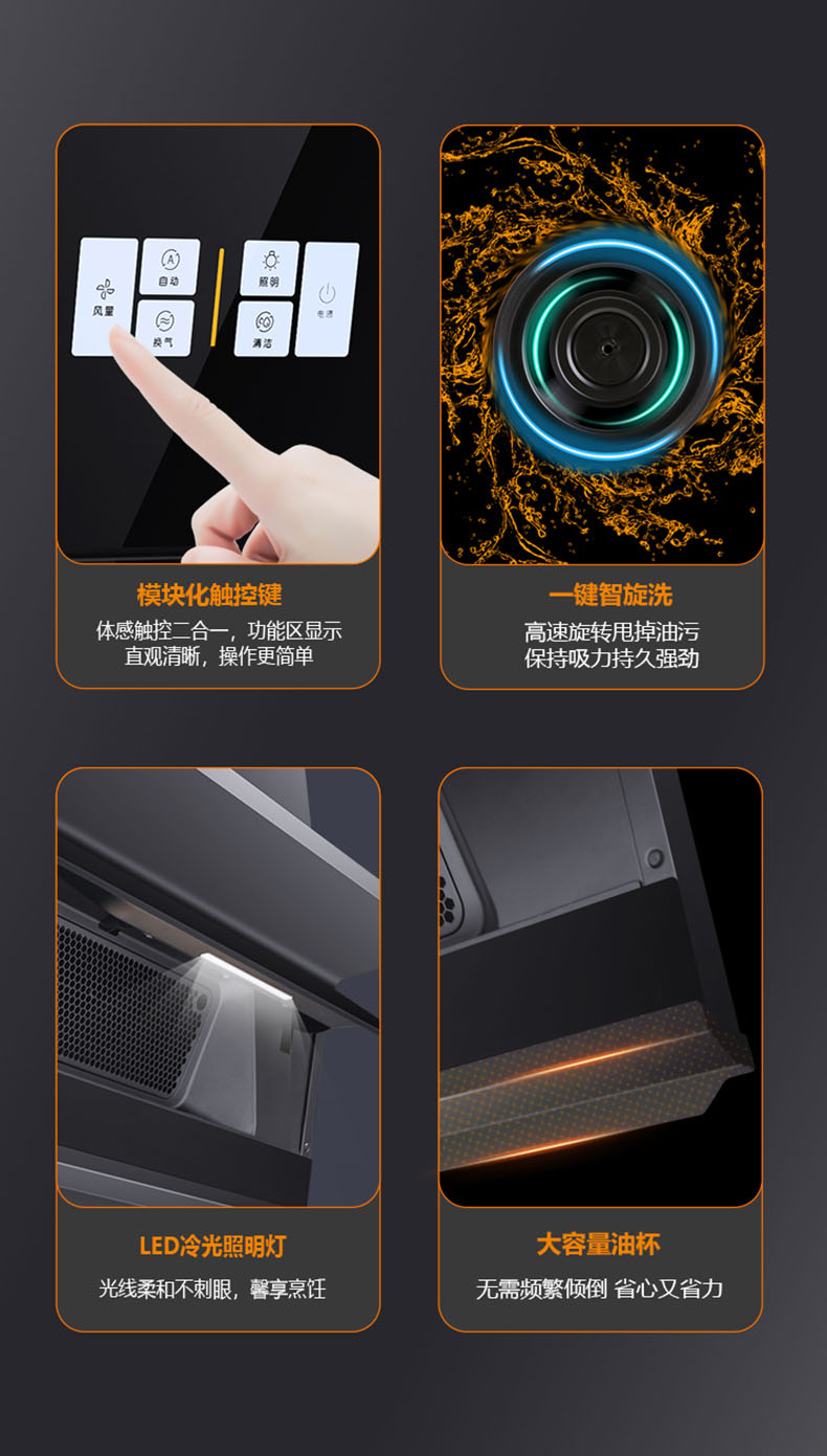 - 采用58°黃金開(kāi)合角,緊鎖油煙不逃逸